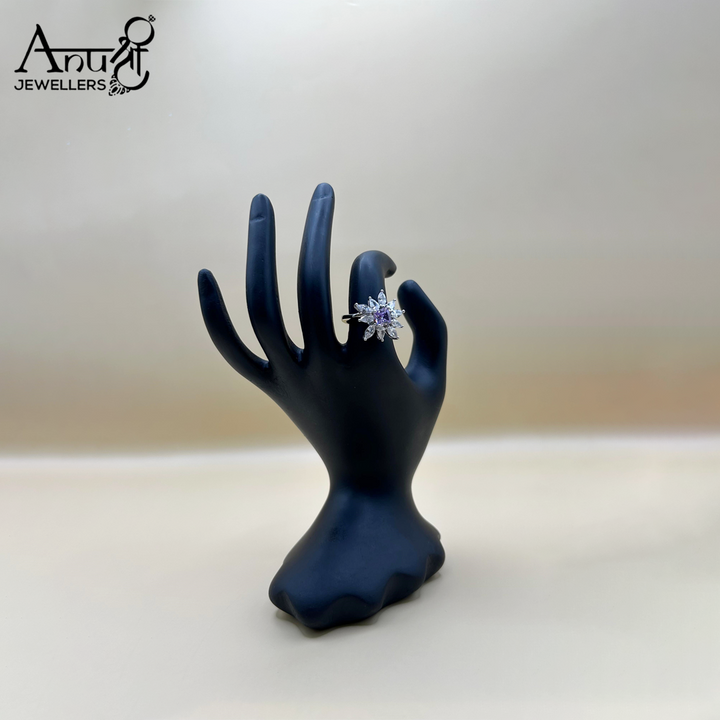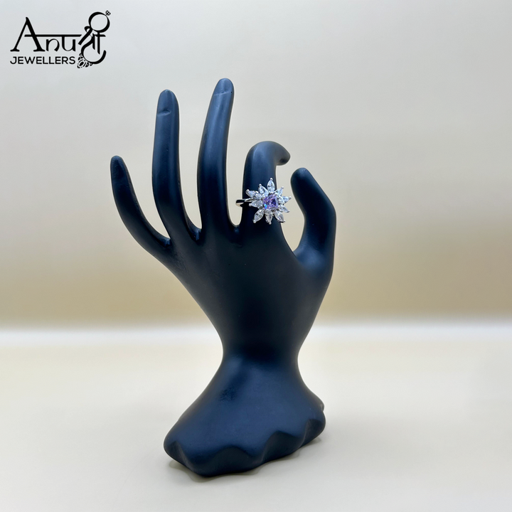 Exquisite silver ring featuring a radiant purple centerstone surrounded by sparkling crystal petals. This enchanting floral design captures nature's beauty with sophisticated elegance, perfect for adding color and charm.