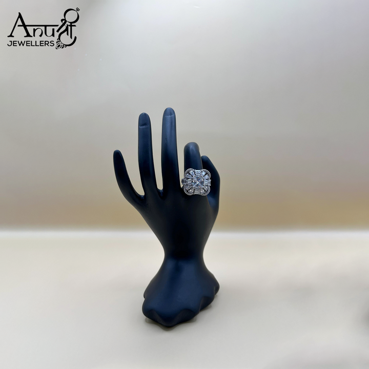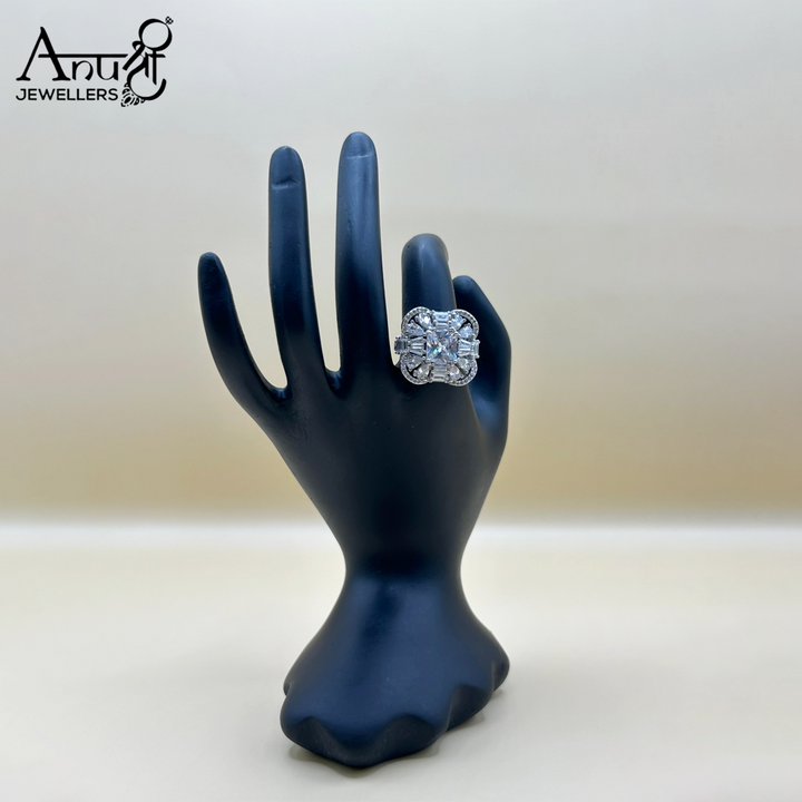 This elegant ring features a bold, square or cushion-shaped head composed of a central cluster of brilliant-cut stones, giving the illusion of a single large gem. The central cluster is framed by a silver-tone bezel and surrounded by a delicate outer halo of pave-set stones. The entire design is finished with subtle milgrain detailing, lending the piece a distinct vintage, geometric, and regal appeal. It's a statement ring perfect for adding timeless glamour.