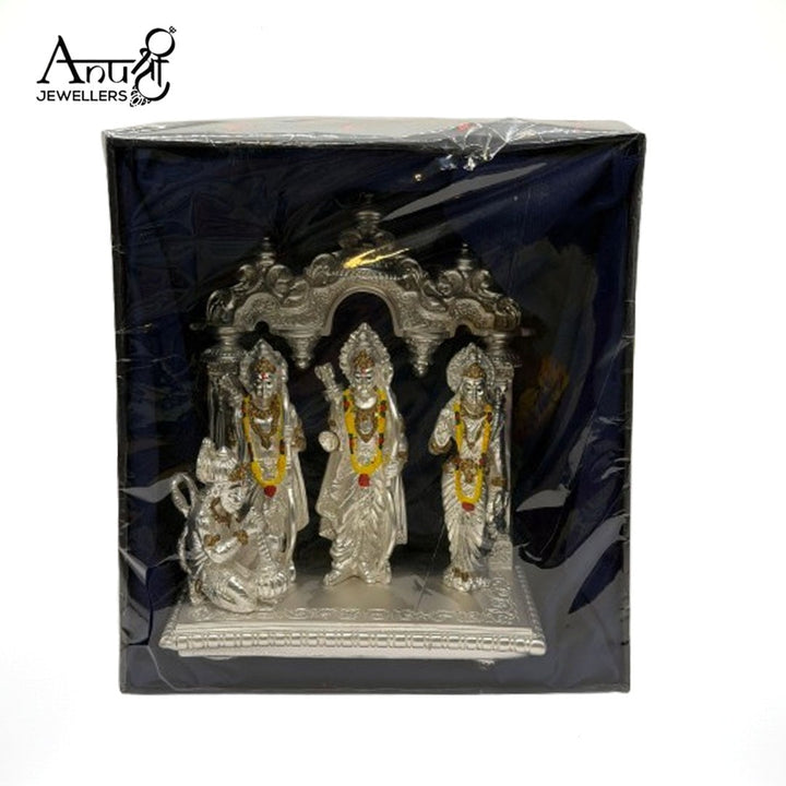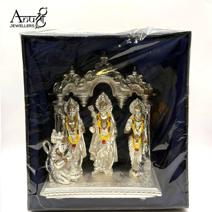 Silver Ram Darbar Idol in Shrine. A devotional silver idol set depicting the Ram Darbar. It features Lord Rama, Goddess Sita, and Lord Lakshmana standing under an arch, with Lord Hanuman seated respectfully at their feet.