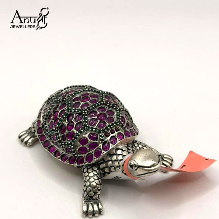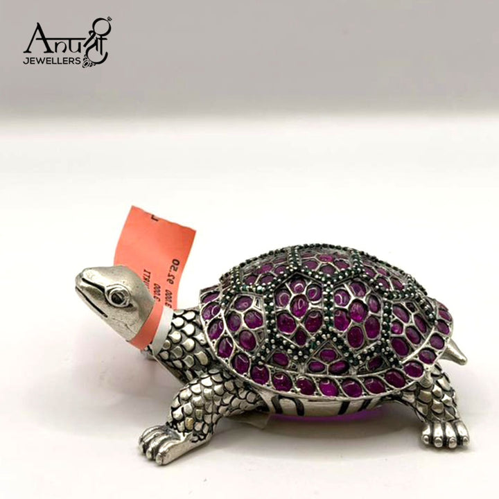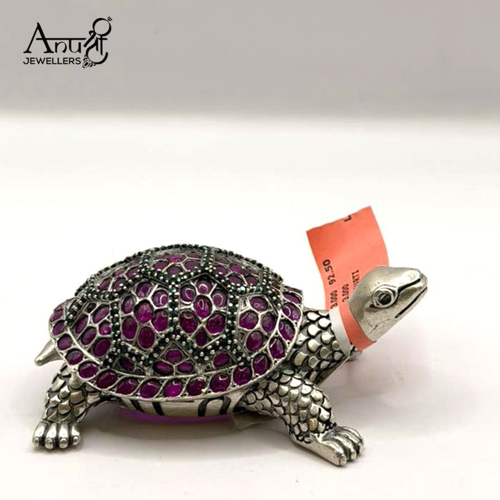Gem-Embellished Silver Tortoise. This stunning 103.000-gram silver tortoise figurine is a beautiful blend of spirituality and artistry. The detailed silver body supports a shell exquisitely studded with vibrant deep purple (ruby) and green stones. As a symbol of luck, longevity, and a representation of Lord Vishnu, this impressive piece is a perfect, auspicious item.