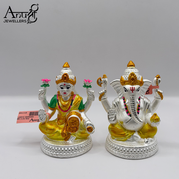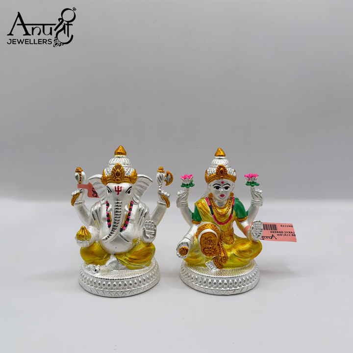 Hand-Painted Silver Lakshmi Ganesha Set. This exquisite 107.000-gram silver idol set features Goddess Lakshmi and Lord Ganesha seated on intricately patterned pedestals. The idols are beautifully enhanced with vibrant hand-painted colors (yellow, green, gold, and red), making this auspicious pair a striking symbol of prosperity, wisdom, and festive joy.