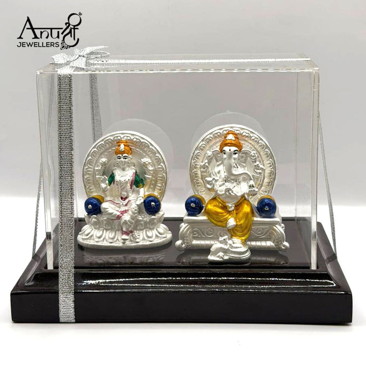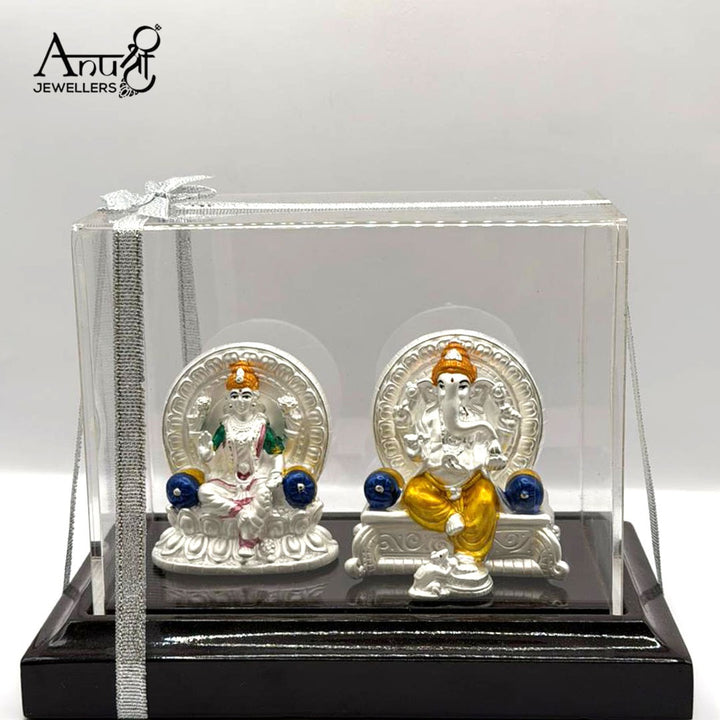 Silver Lakshmi Ganesha Gift. This 111.720-gram silver set features Goddess Lakshmi and Lord Ganesha seated on embossed pedestals, framed by intricate, circular backdrops. Accented with golden yellow, orange, and deep blue colors, this auspicious pair symbolizes wealth and wisdom. This set from Anushree Jewellers is a luxurious and perfect offering for any celebration.