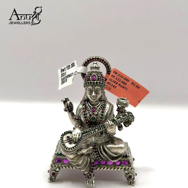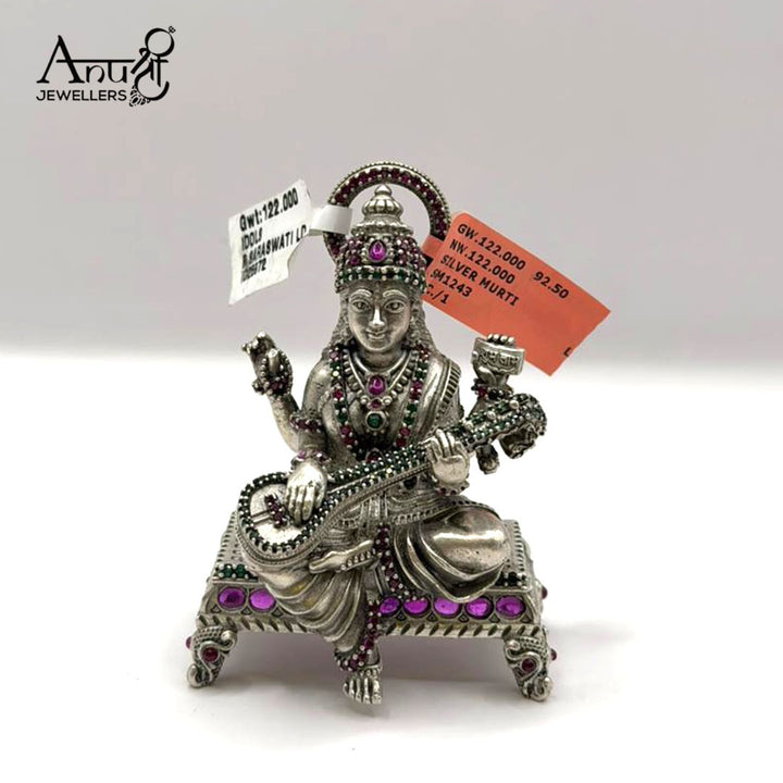 Gem-Embellished Silver Saraswati Idol. This magnificent 112.000-gram silver idol of Goddess Saraswati captures the deity of knowledge and music elegantly playing the veena. The idol is exquisitely detailed and richly embellished with ruby/pink stones on the crown, jewelry, and ornate base.