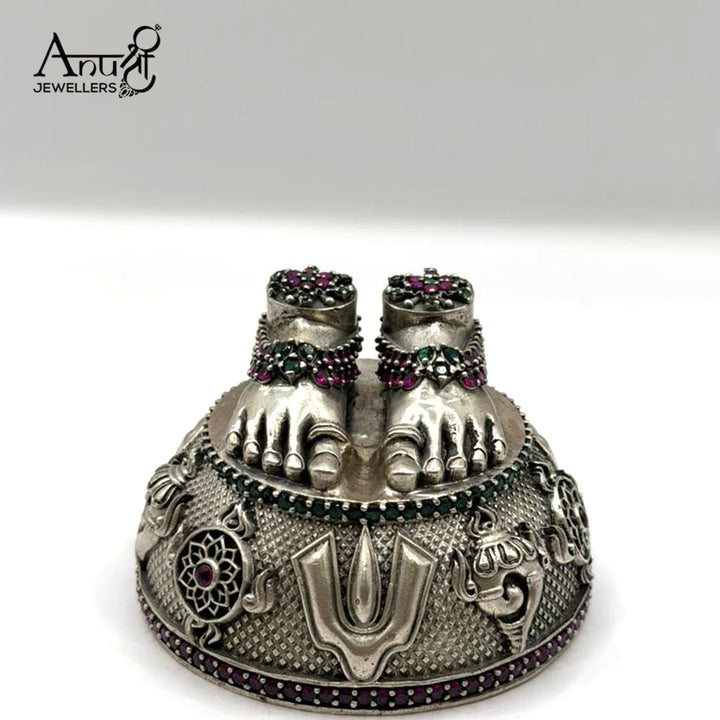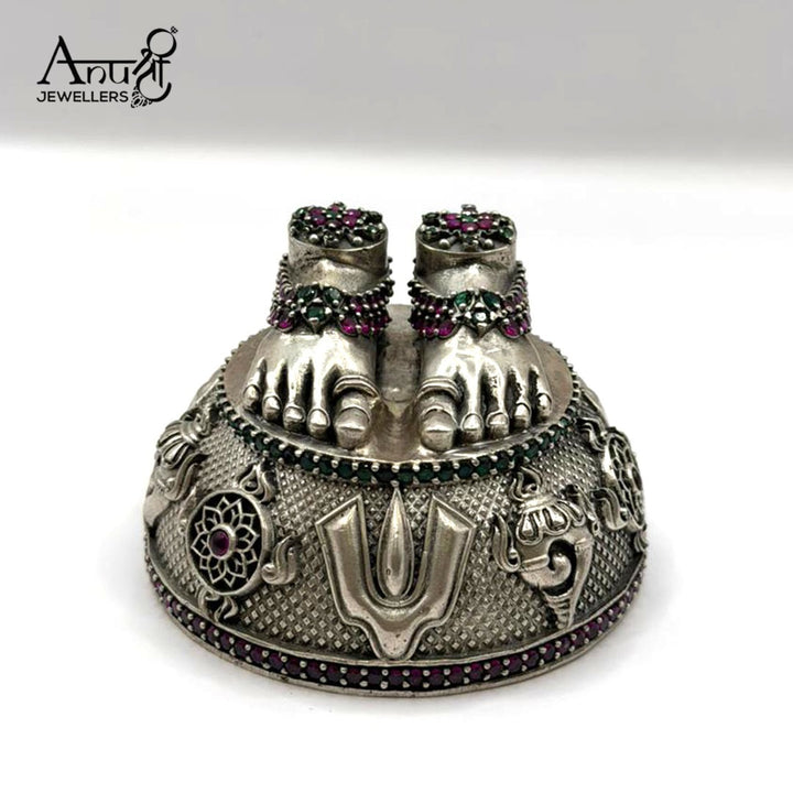 This exquisitely detailed 156.700-gram silver Charan Paduka features a realistic depiction of divine feet resting on an ornate, dome-shaped base. The piece is richly embellished with deep ruby/pink stones and intricate devotional motifs like the Vishnu Tilak and conch shell.