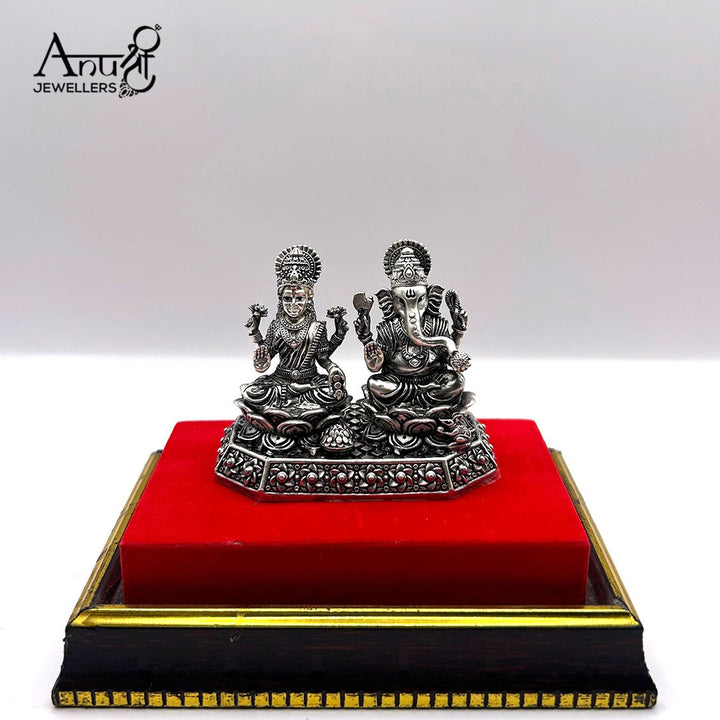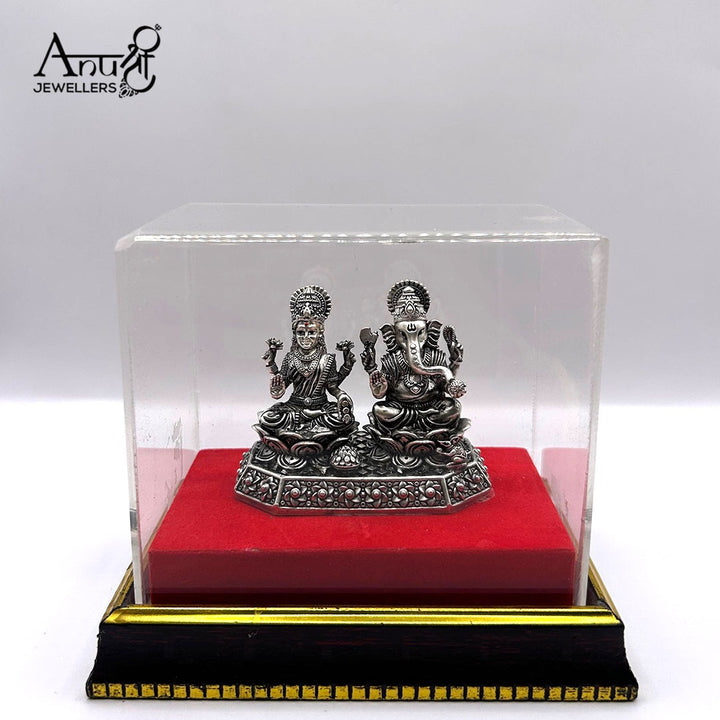 Auspicious Silver Lakshmi-Ganesha Idol. This exquisitely detailed idol features Goddess Lakshmi (for wealth) and Lord Ganesha (for good fortune and removing obstacles), seated together on a shared base. Weighing 157.270 grams, it is an ideal and auspicious gift, especially for housewarmings or festivals like Diwali.