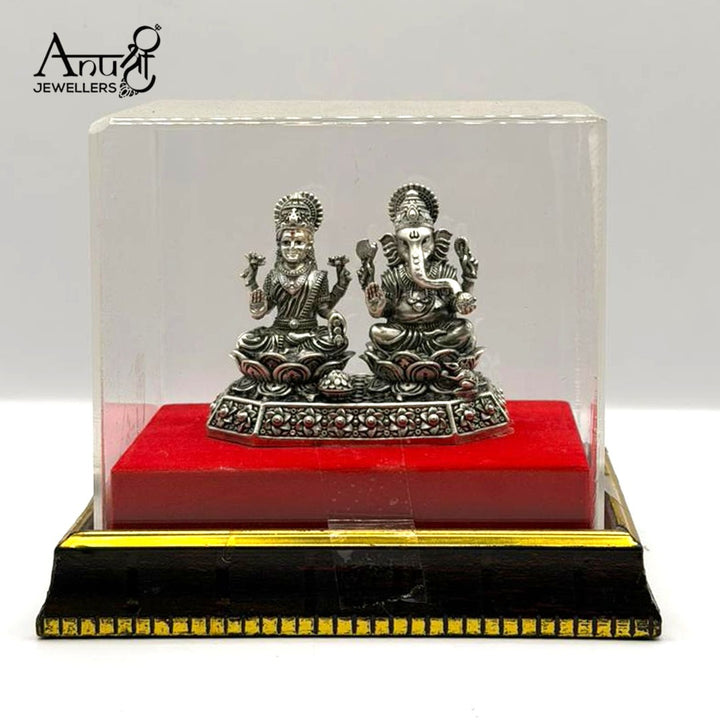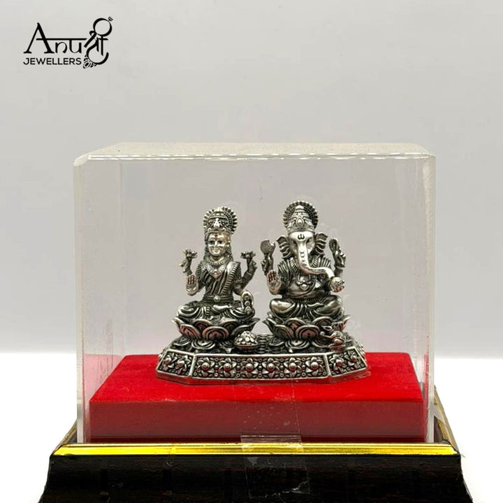 Antique Finish Silver Lakshmi Ganesha Set. This magnificent 157.270-gram silver set features Goddess Lakshmi and Lord Ganesha seated on beautifully embossed lotus pedestals, which share an ornate, detailed base. Elegantly presented in a clear acrylic display case with a red velvet base, this auspicious set from Anushree Jewellers is a premium offering for worship or gifting.
