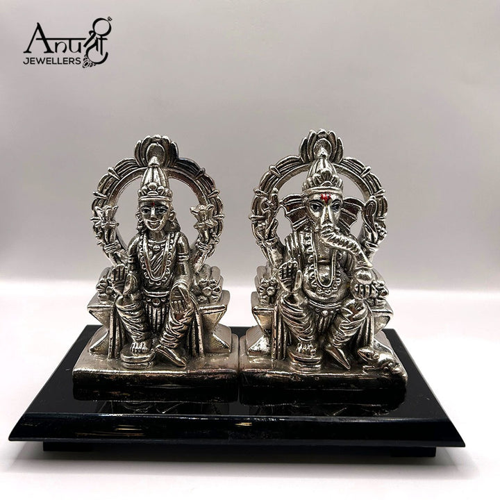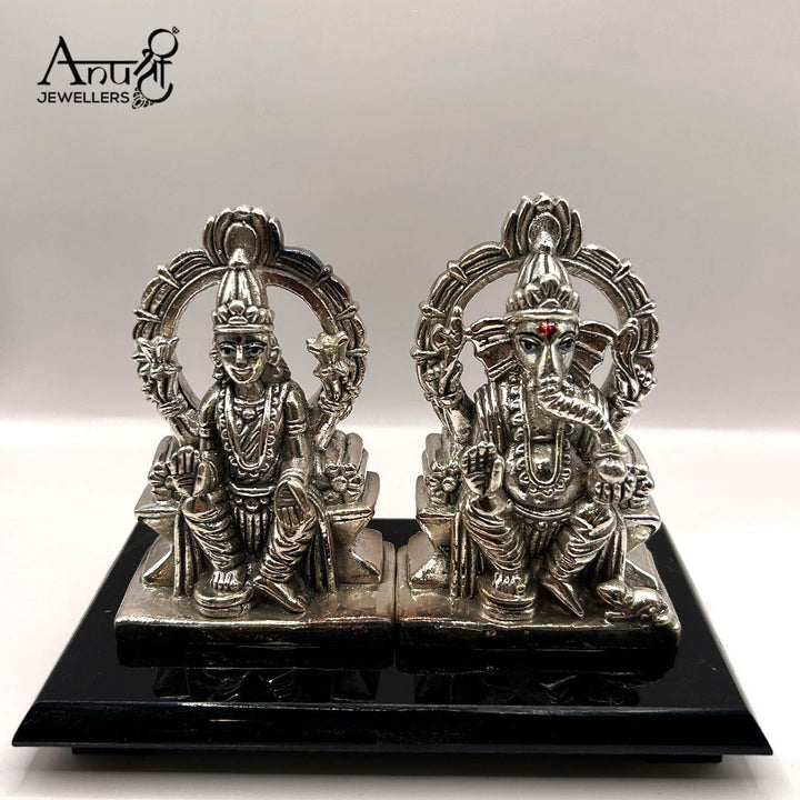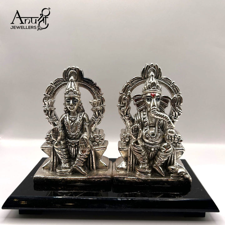 Exquisite silver-finished figurines of Goddess Lakshmi and Lord Ganesha on elegant black marble base. These sacred sculptures bring divine blessings of prosperity, wisdom, and good fortune to homes and offices.