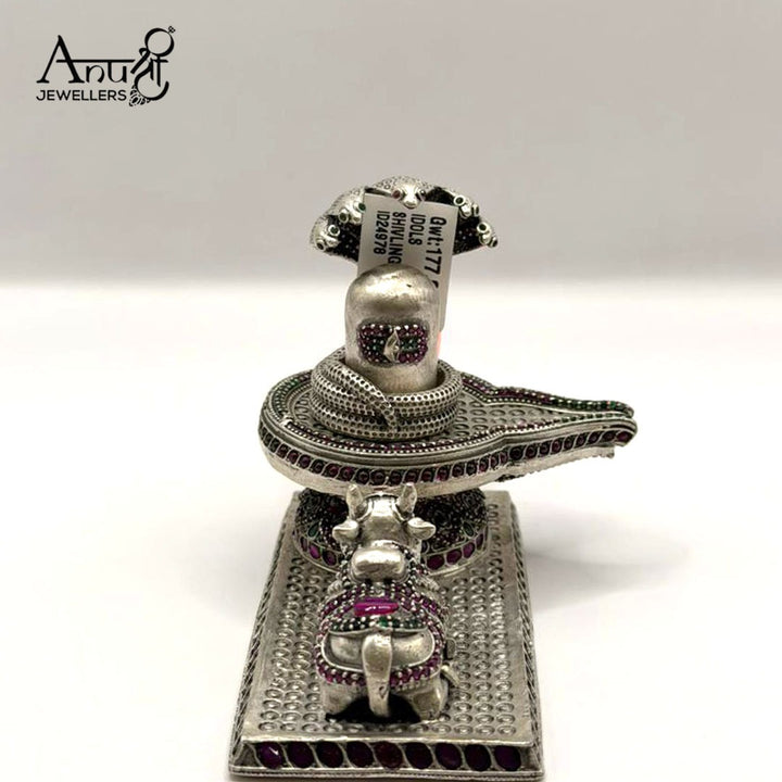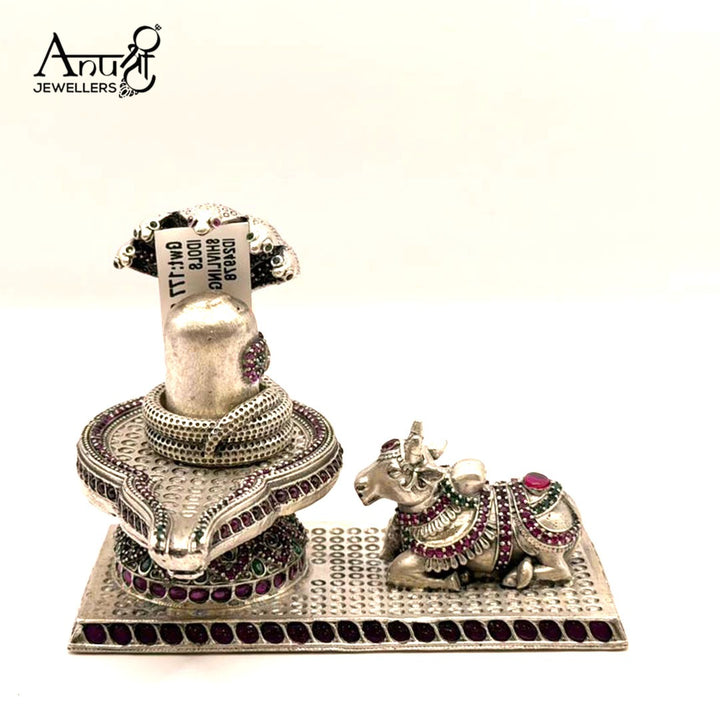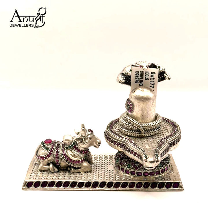 Embellished Silver Shivling & Nandi Set. This deeply devotional 177.000-gram silver set features an exquisitely detailed Shivling and Nandi set upon an ornate rectangular base. Both idols are richly embellished with ruby/pink stones, symbolizing devotion and auspiciousness.