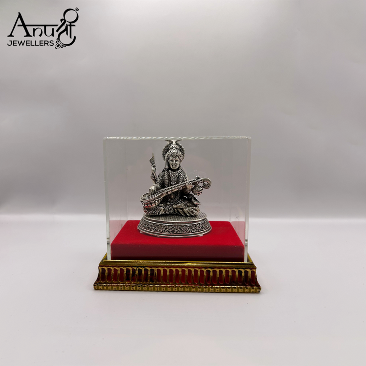 Exquisite Silver Saraswati Idol in Display. This magnificent idol features Goddess Saraswati, the deity of knowledge, music, and art, playing the veena. This spiritual piece is elegantly presented in a clear acrylic display case on a rich red and gold base. The entire item weighs 203.610 grams, making it an ideal gift for students or art enthusiasts.
