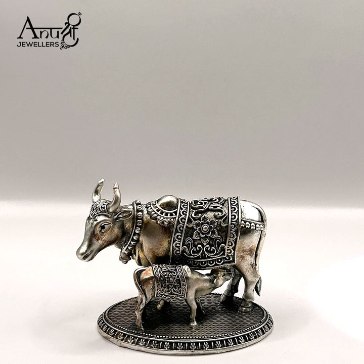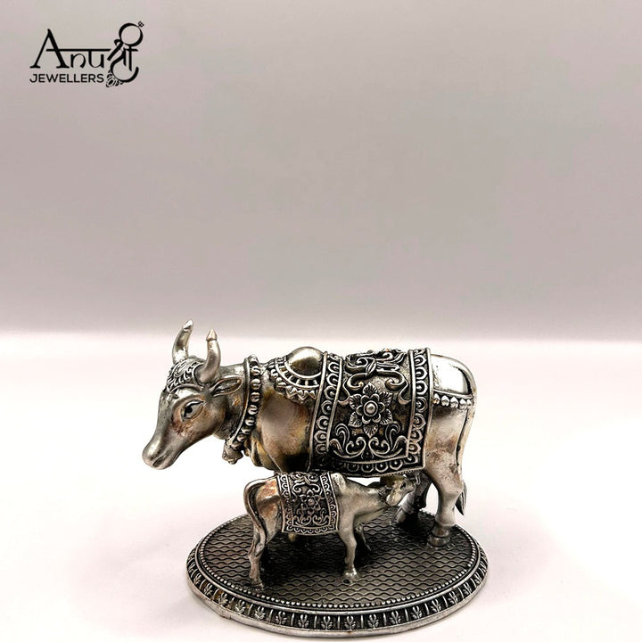 Auspicious Silver Cow and Calf Idol. This beautiful representation of the Nandi Cow and Calf is a traditional symbol of prosperity, motherhood, and abundance. This elegant piece of fine devotional art weighs 212.070 grams, making it an ideal item for spiritual reverence or gifting.