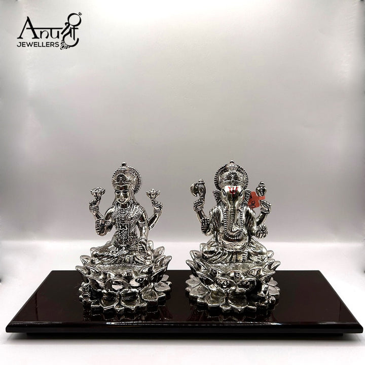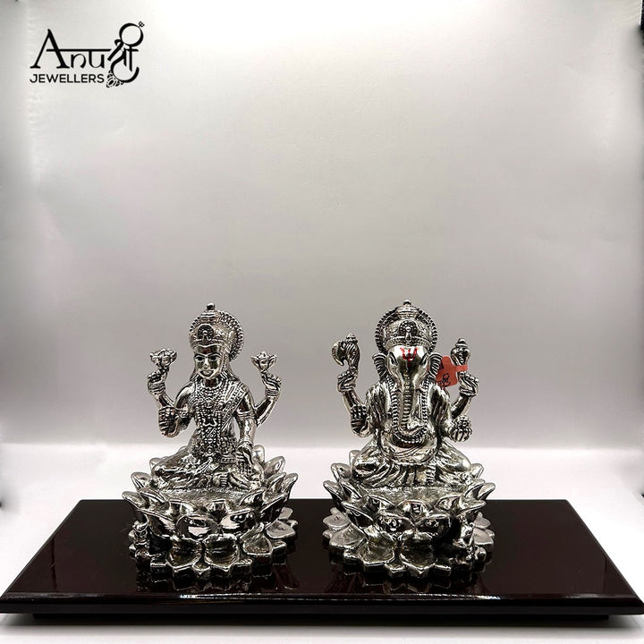 Stunning silver figurines of Goddess Lakshmi and Lord Ganesha gracefully seated on detailed lotus pedestals. These masterfully crafted pieces symbolize purity, prosperity, and divine blessings for sacred spaces.