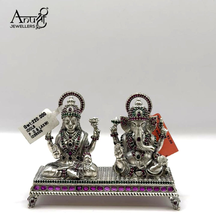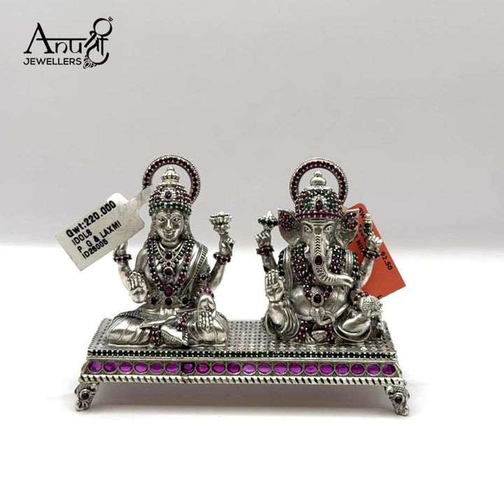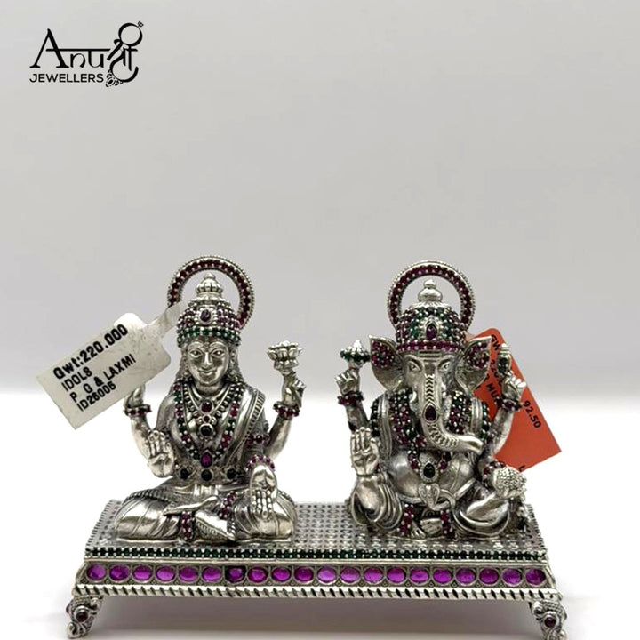 Silver Lakshmi Ganesha Set. This stunning 220.000-gram silver idol set features Goddess Lakshmi and Lord Ganesha seated together on an ornate, unified platform supported by delicate feet. This powerful and auspicious piece is a magnificent symbol of wealth and wisdom, perfect for a grand display or special religious offering.