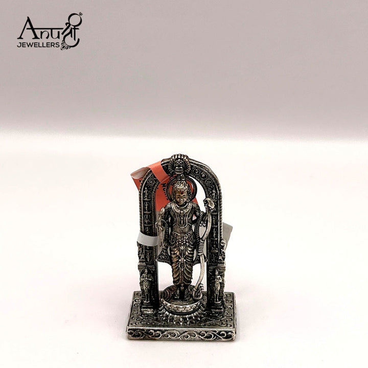 An exquisite oxidized silver temple frame featuring a standing deity, likely Lord Rama, with an ornate arch. This finely detailed miniature structure is perfect for your puja altar, car dashboard, or as a revered, traditional gift.