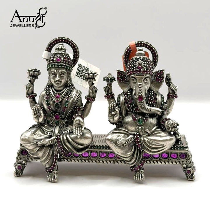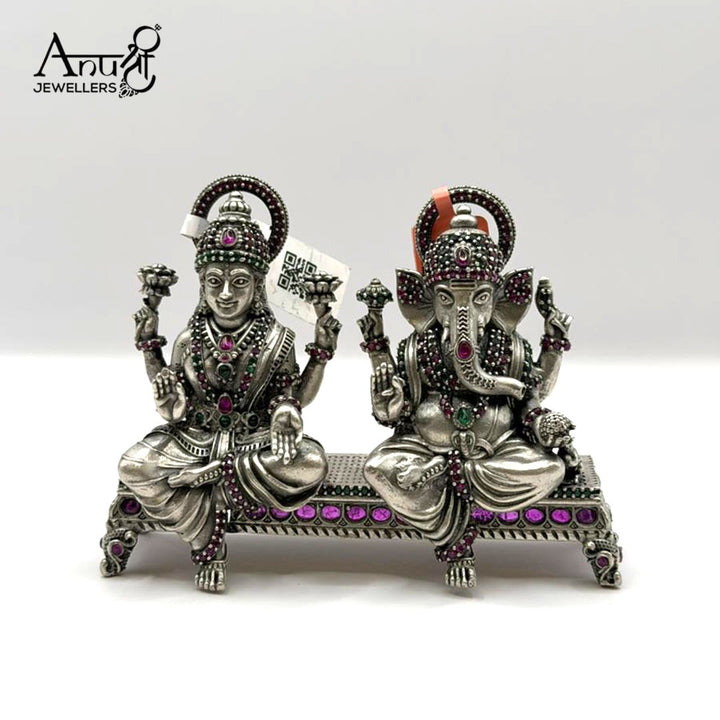 This magnificent241.500-gram silver idol setfeatures GoddessLakshmiand LordGaneshaseated side-by-side on a shared, ornate platform. Both deities are lavishly embellished with hundreds ofdeep ruby and emerald-green stoneson their crowns, jewelry, and pedestal.