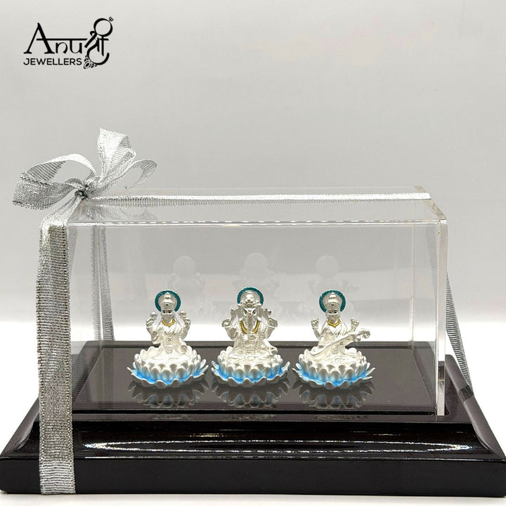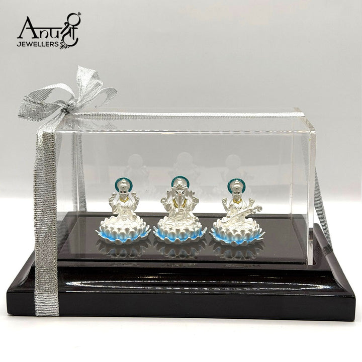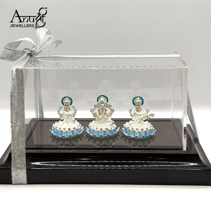 This charming silver idol set features Lord Ganesha, Goddess Lakshmi, and Goddess Saraswati, symbolizing auspiciousness, wealth, and knowledge. Weighing 26.460 grams, the trio sits on blue-highlighted lotus bases, elegantly presented in a clear display box with a silver ribbon on a black wooden base. It is a complete and magnificent gift of blessings for any important milestone or festival.