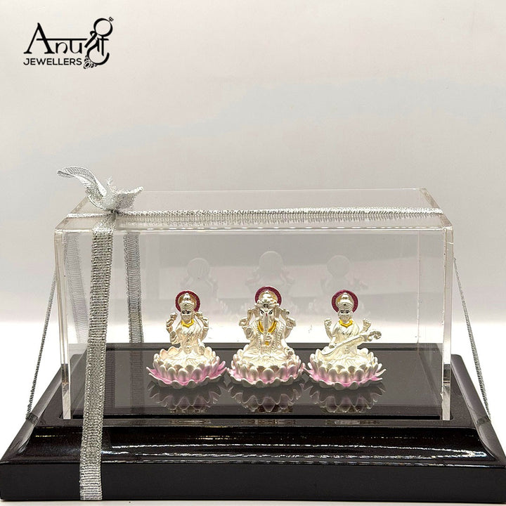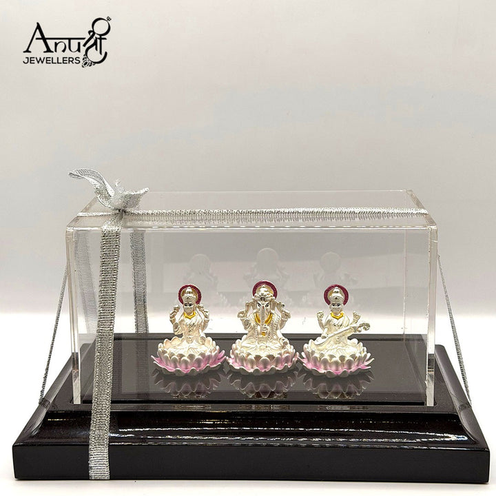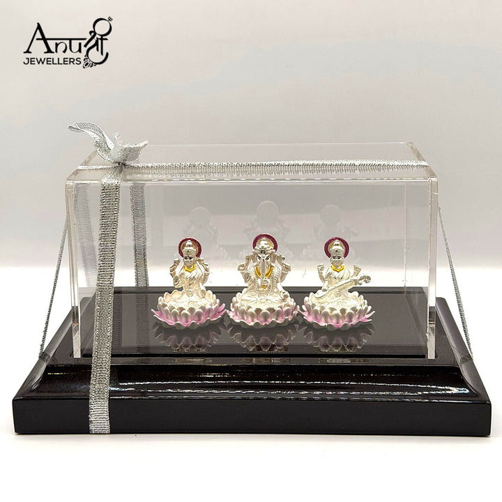 This magnificent silver idol set features Lord Ganesha, Goddess Lakshmi, and Goddess Saraswati, symbolizing the trifecta of auspiciousness, wealth, and knowledge. Weighing 27.050 grams, the divine trio sits on beautiful pink-accented lotus bases. Presented in a clear display box tied with a silver ribbon on a black wooden base, this set is a truly elegant and complete gift of blessings.
