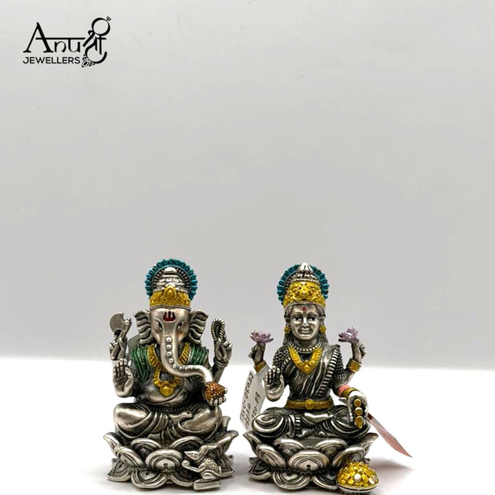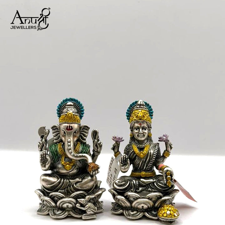 Hand-Painted Silver Lakshmi Ganesha Set. This magnificent 320.030-gram silver set features Goddess Lakshmi and Lord Ganesha on ornate lotus bases, brilliantly accented with gold, blue, and green colors. Elegantly packaged for gifting, this auspicious set is a powerful symbol of prosperity and wisdom.