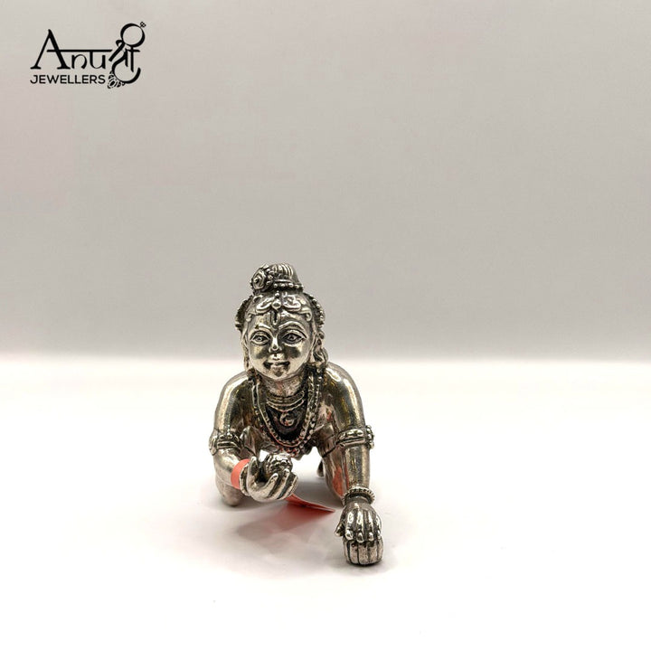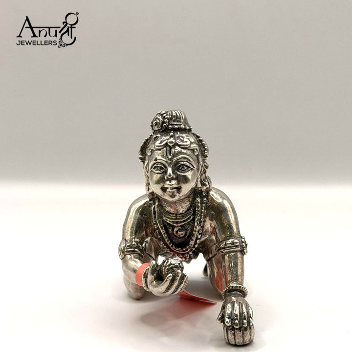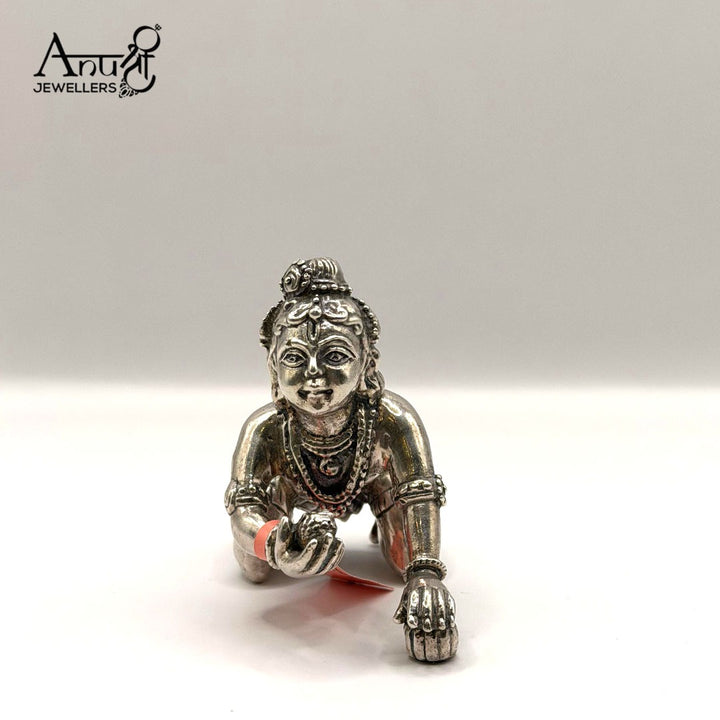 Charming Silver Bal Krishna Idol. This deeply enchanting 327.600-gram silver idol depicts Bal Krishna (Laddu Gopal) crawling, with a blissful expression and holding his favorite treat. This beautifully detailed Murti, often associated with joy and childhood blessings, is a treasured piece for daily worship or a precious gift to welcome a child into the home.