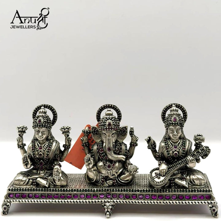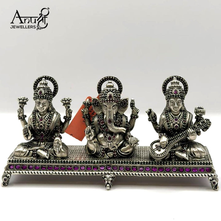 This magnificent 348.300-gram silver set features the auspicious trio: Lakshmi, Ganesha, and Saraswati on a unified, ornate platform. This high-value piece symbolizes the convergence of wealth, wisdom, and knowledge, making it a powerful and impressive offering for your home altar.