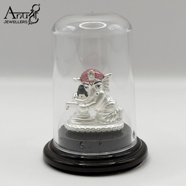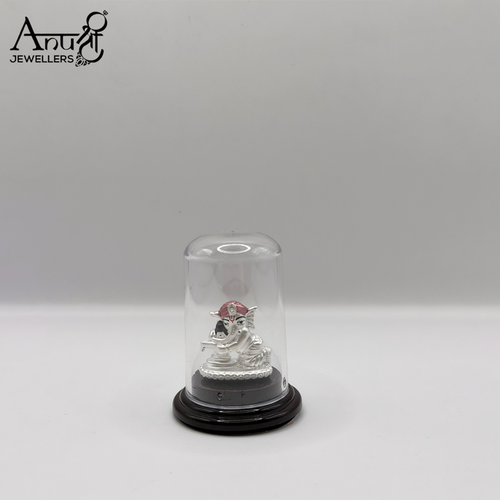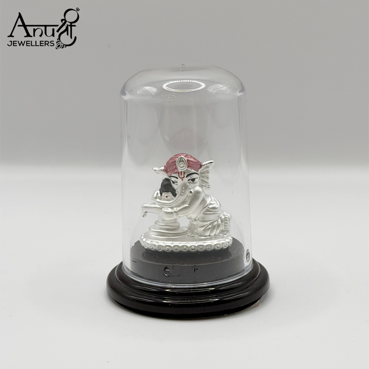 This charming silver idol of Lord Ganesha is seated near a Shivalinga, perfectly encased in a clear glass cloche with a black base. Weighing 4.620 grams, this delightful miniature idol symbolizes the blessings of new beginnings and devotion. It's a wonderful, protective piece for a car dashboard or a small, auspicious gift.
