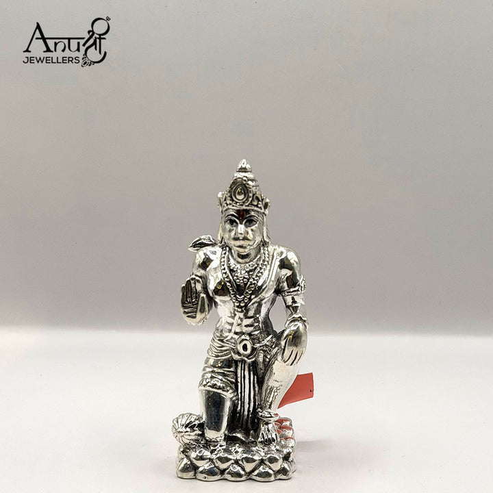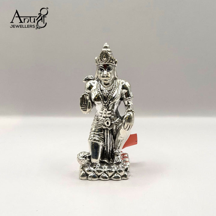 This magnificent silver idol depicts Lord Hanuman kneeling in devotion, offering blessings with his hand raised. Weighing 41.500 grams, this finely crafted figure symbolizes strength, devotion, and protection. The detailed silver work captures the Lord's powerful form.