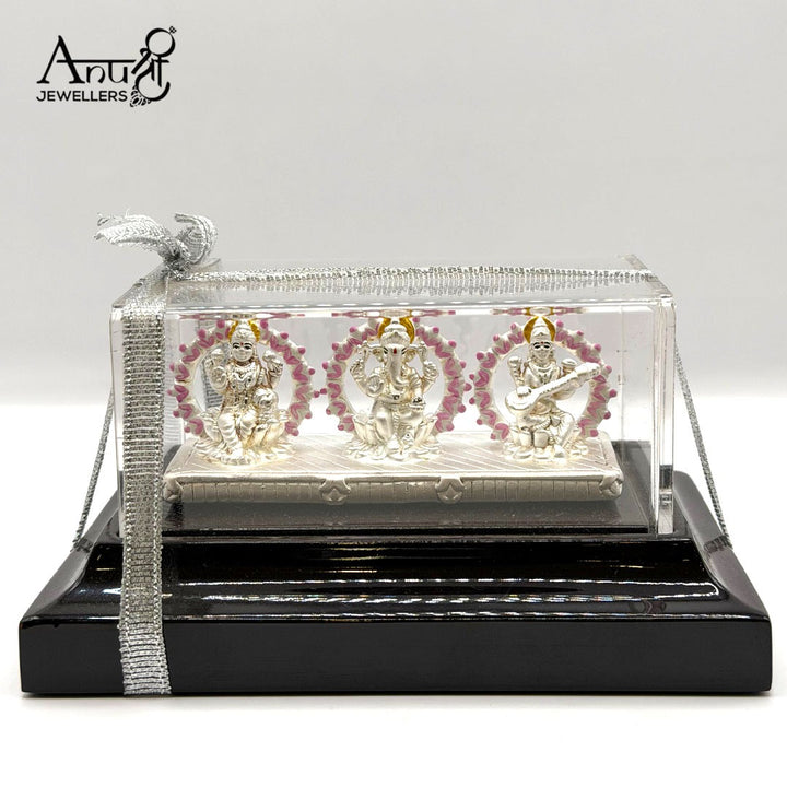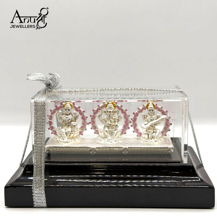 This beautiful silver idol set features Lord Ganesha, Goddess Lakshmi, and Goddess Saraswati together, symbolizing auspiciousness, wealth, and knowledge. Weighing 42.470 grams, the trio is elegantly presented on a platform within a clear display box, tied with a silver ribbon on a black base. It makes a stunning and complete gift of blessings for any important occasion.