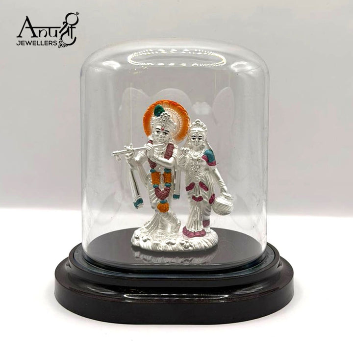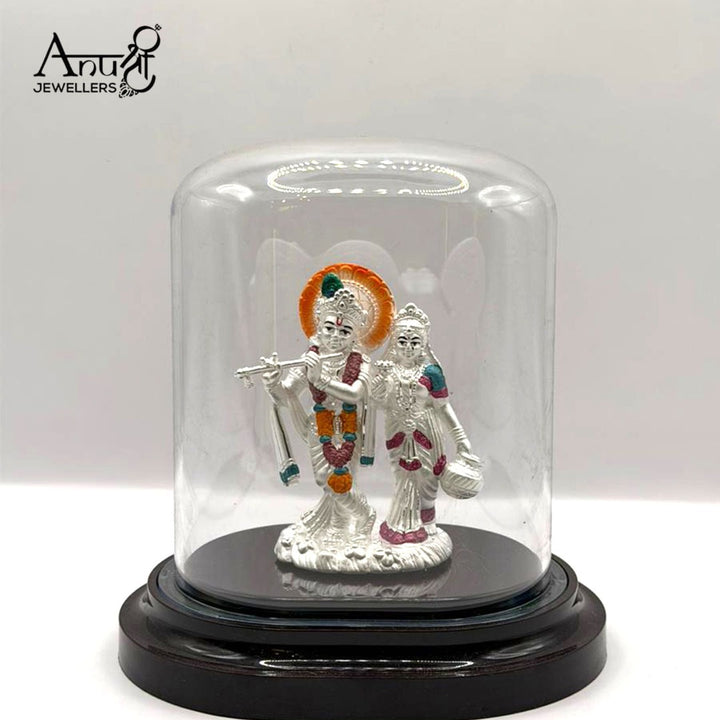 This beautiful silver idol depicts the divine couple Radha and Krishna, symbolizing eternal love and devotion, with subtle hand-painted accents. Weighing 43.960 grams, the exquisite figure is perfectly showcased within a large, protective glass cloche set on a polished dark wooden base.