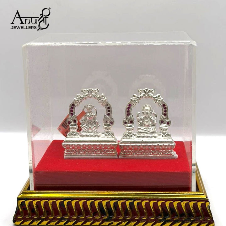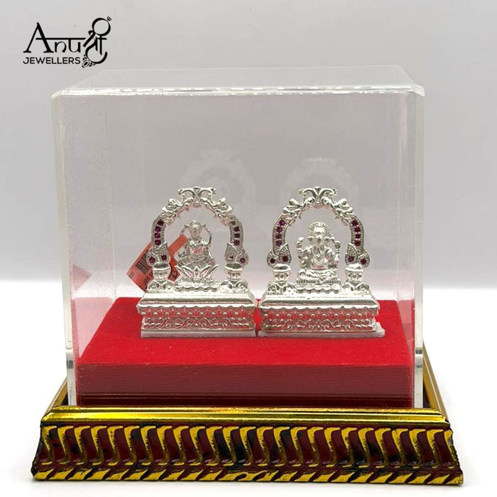 This stunning silver idol pair features Goddess Lakshmi and Lord Ganesha, each under a detailed archway accented with ruby-coloured stones. Weighing 45.330 grams, this set symbolizes wealth, prosperity, and auspicious beginnings. The idols are elegantly presented on a red velvet base within a clear acrylic box, resting on a decorative gold-finish stand.