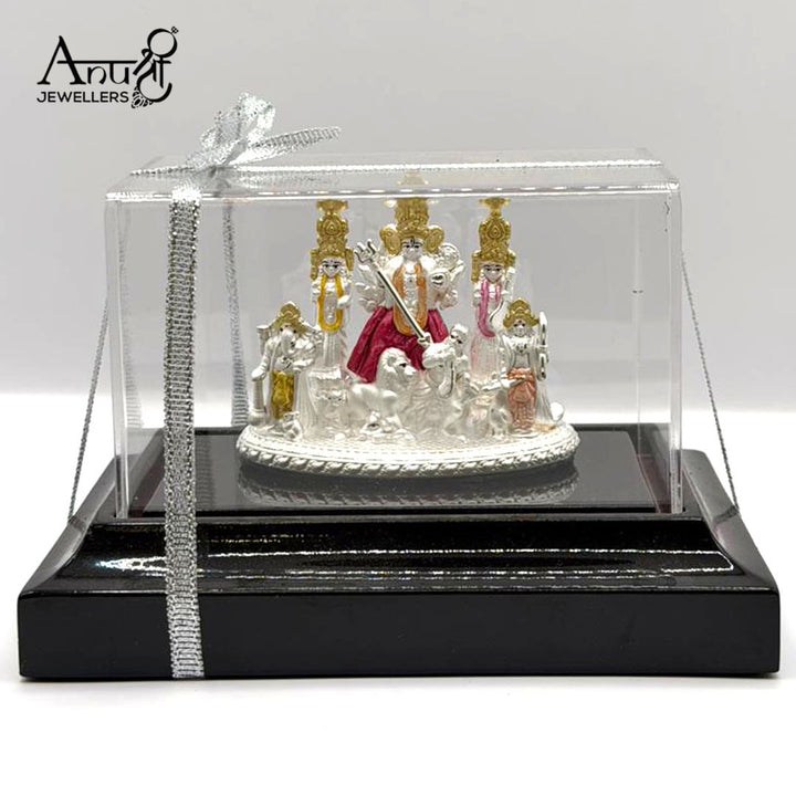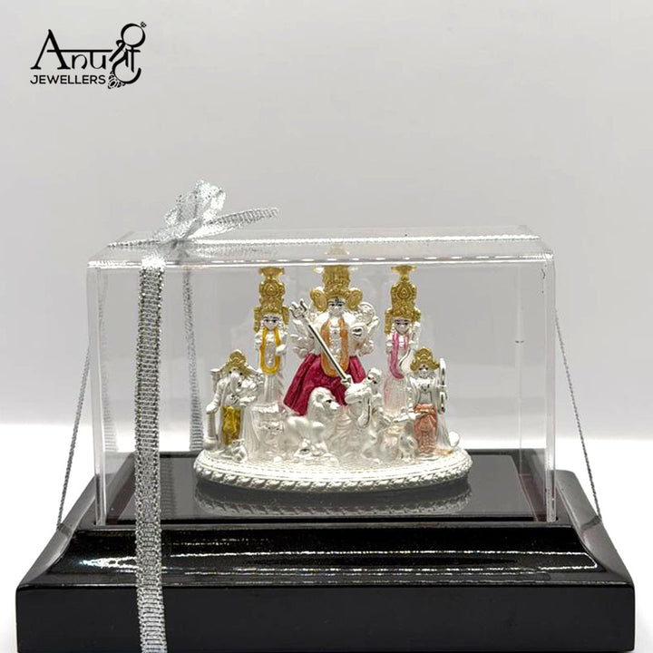 This spectacular silver idol set showcases Goddess Durga with her nine forms (Navdurga) and her vahana, the lion, symbolizing complete power and protection. Weighing 47.350 grams, the highly detailed figures are elegantly presented in a clear acrylic box. This is a magnificent and auspicious gift ideal for festivals like Navratri or housewarmings.