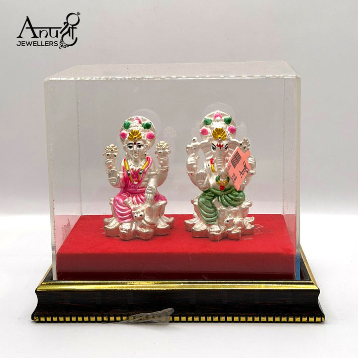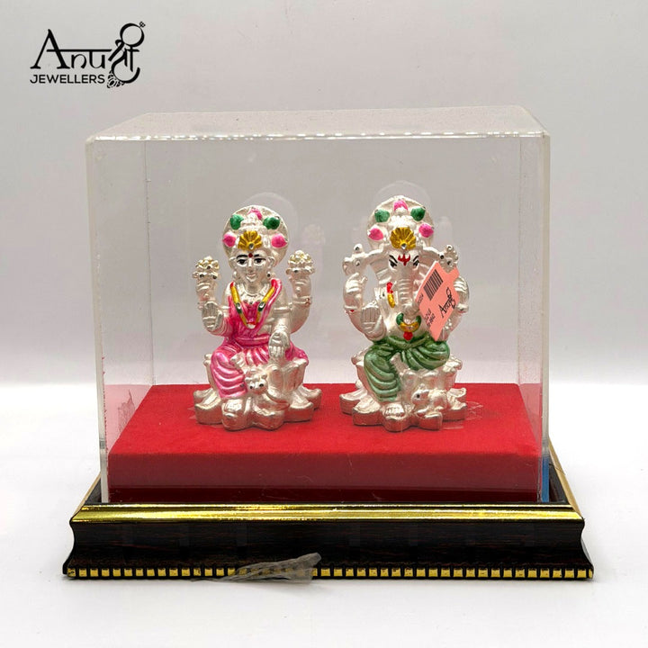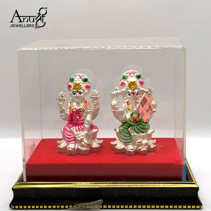 This stunning silver idol pair features Goddess Lakshmi (in pink accents) and Lord Ganesha (in green accents), symbolizing wealth, prosperity, and auspicious beginnings. Weighing 49.210 grams, the idols are beautifully showcased on a red velvet base within a protective clear display box. This set makes a complete and magnificent gift for Diwali or housewarmings.