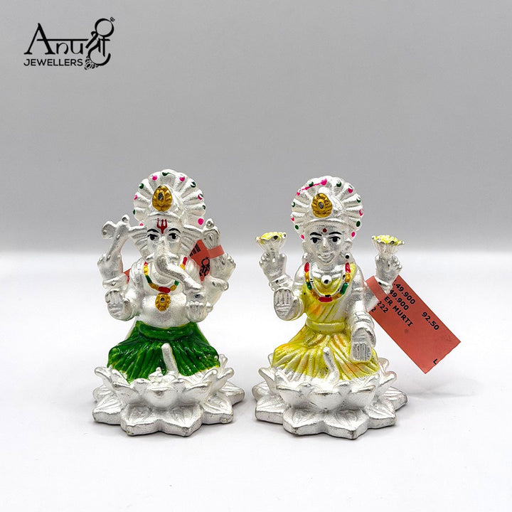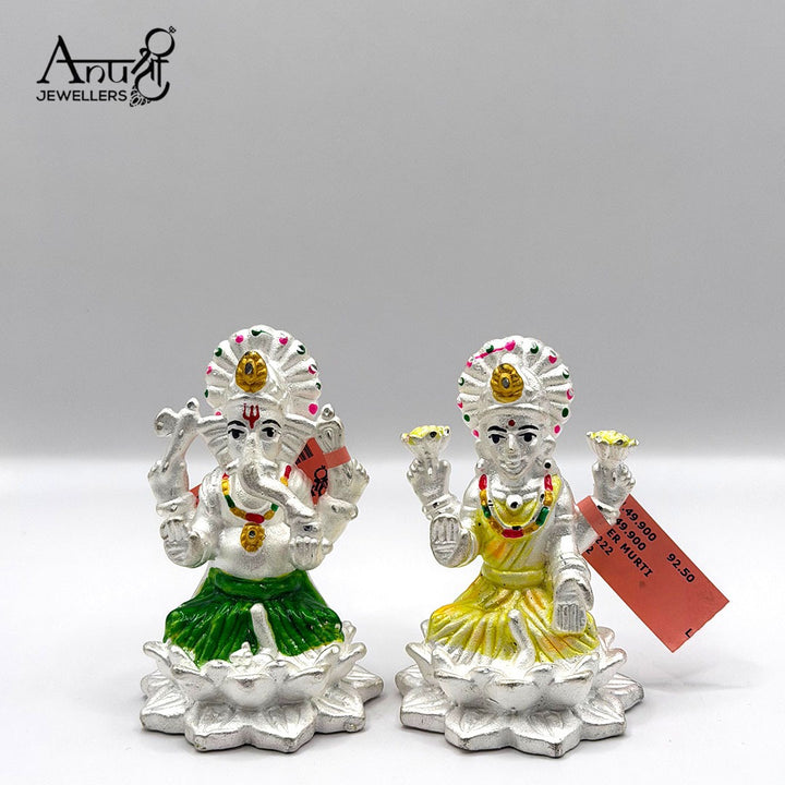 This radiant silver idol pair features Lord Ganesha (in green) and Goddess Lakshmi (in yellow), symbolizing auspicious beginnings and wealth. Weighing 49.900 grams, the figures are intricately detailed with colorful accents and seated upon silver lotus bases. This magnificent, brightly colored set is perfect for Diwali puja, housewarmings, or as a vibrant, auspicious gift.