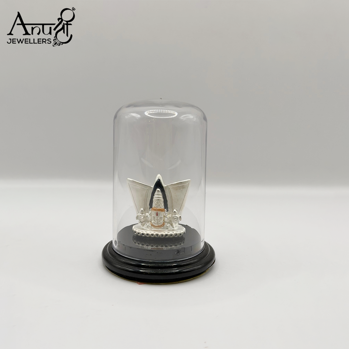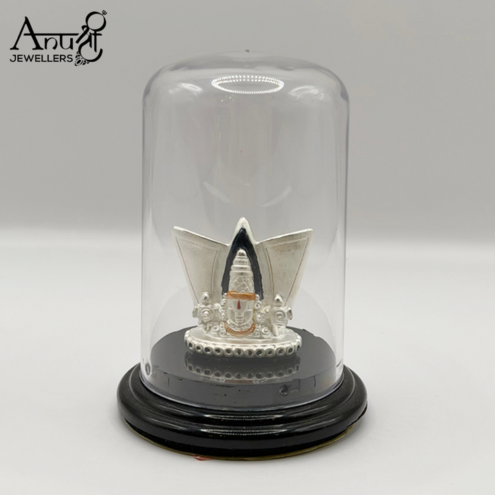 This finely crafted silver Tirupati Balaji idol is elegantly presented within a protective glass dome on a black base. Weighing 5.720 grams, this miniature representation of Lord Venkateswara brings a sense of divinity and protection. It's a perfect and auspicious addition for your car dashboard or a thoughtful gift for any occasion.