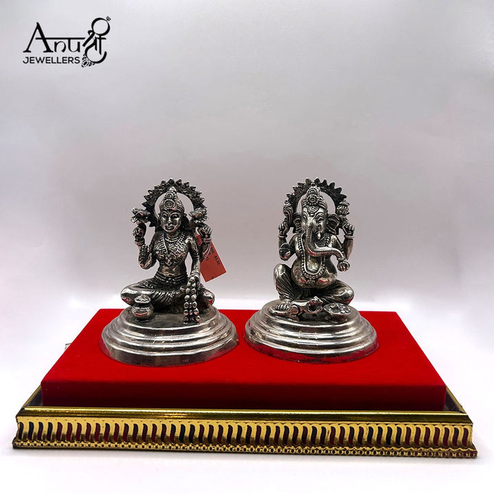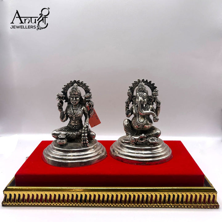 Magnificent silver figurines of Goddess Lakshmi and Lord Ganesha with ornate aureoles, elegantly presented on luxurious red velvet with decorative golden base. Premium ceremonial pieces for distinguished collections.