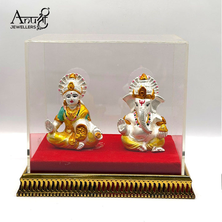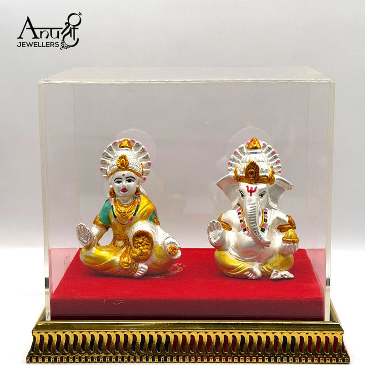 Auspicious Lakshmi-Ganesha Idol Set. This striking silver idol pair features Goddess Lakshmi and Lord Ganesha, symbolizing wealth, prosperity, and auspicious beginnings. Weighing 54.800 grams, the idols are prominently displayed on a red velvet base within a protective clear acrylic box. This magnificent piece is perfect for Diwali or as a luxurious, complete auspicious gift.