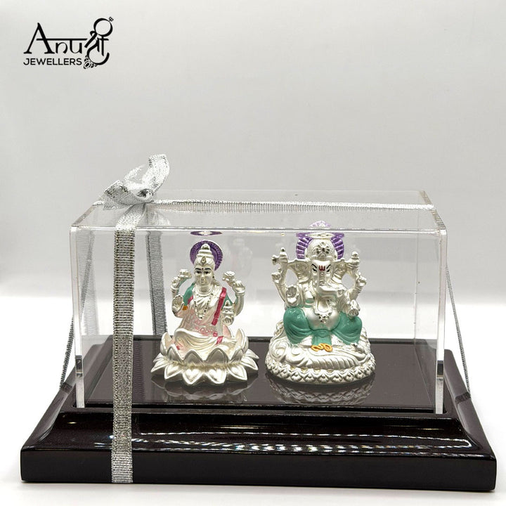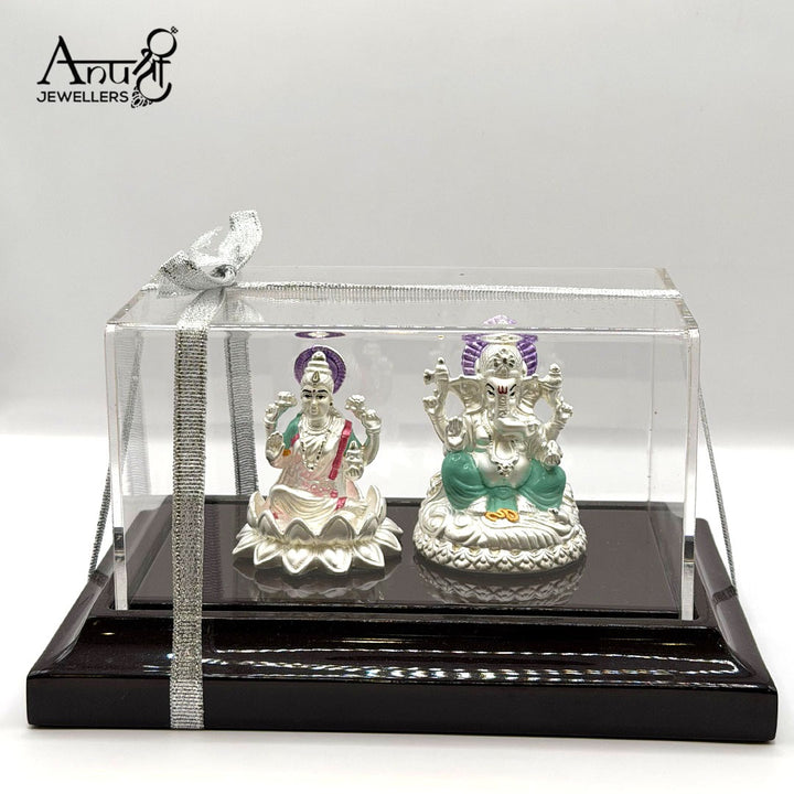 Auspicious Lakshmi-Ganesha Gift Set. This magnificent silver idol pair features Goddess Lakshmi and Lord Ganesha, symbolizing wealth and auspicious beginnings. Weighing 55.410 grams, the color-accented idols are elegantly presented in a clear display box, perfect for a luxurious, complete auspicious gift.