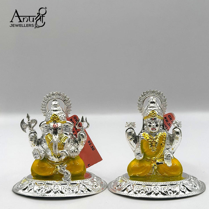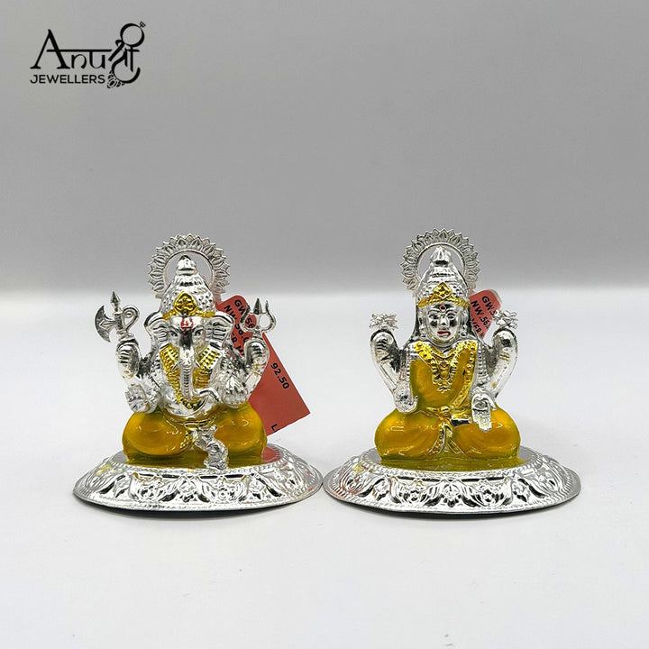 Radiant Silver Lakshmi-Ganesha Idols. This radiant silver idol pair features Goddess Lakshmi and Lord Ganesha, symbolizing wealth, prosperity, and auspicious beginnings. Weighing 56.000 grams, the idols include beautiful gold and yellow accents and are seated on decorative, intricately designed silver bases.
