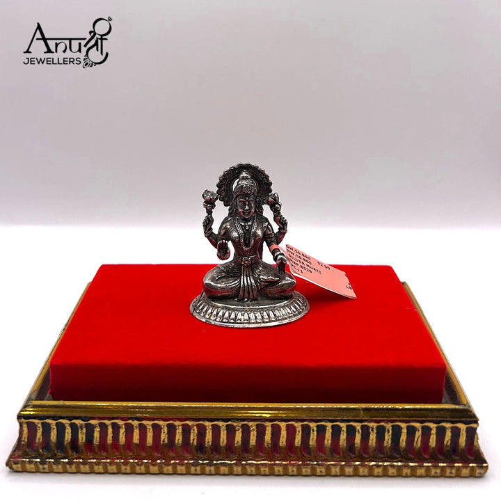 An exquisite oxidized silver idol of Goddess Lakshmi, seated on a lotus, symbolizing wealth and prosperity. The detailed craftsmanship captures her divine grace. An auspicious and traditional gift for festivals or new beginnings.