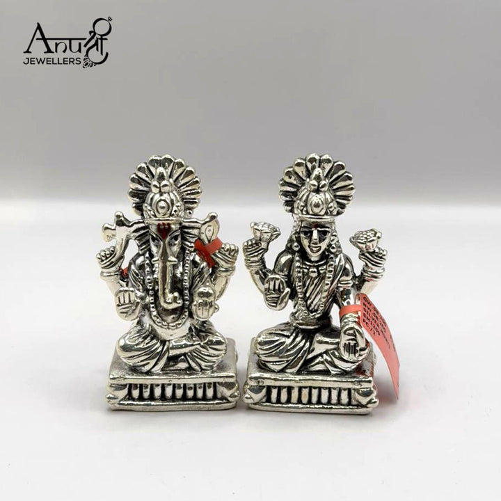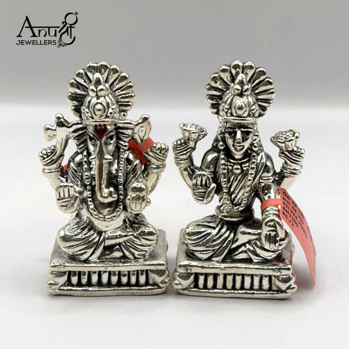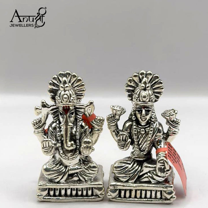 Traditional Silver Lakshmi-Ganesha Idols. This classic silver idol pair features Lord Ganesha and Goddess Lakshmi, beautifully sculpted to symbolize auspicious beginnings and prosperity. Weighing 58.200 grams, this magnificent set from Anushree Jewellers is perfect for a puja altar, festive celebrations, or as a timeless, auspicious gift.