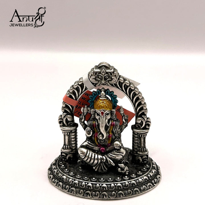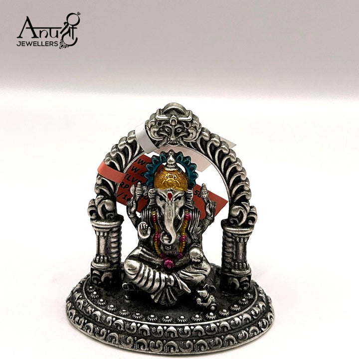 An exquisite oxidized silver idol of Lord Ganesha seated under a detailed archway. Featuring vibrant gold and colorful accents, this auspicious piece is perfect for your car dashboard, office desk, or as a divine gift for prosperity.