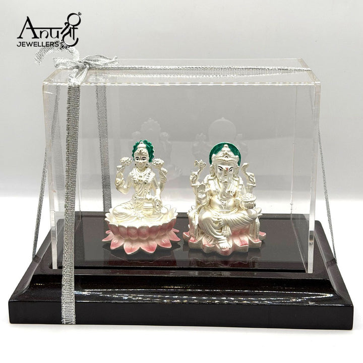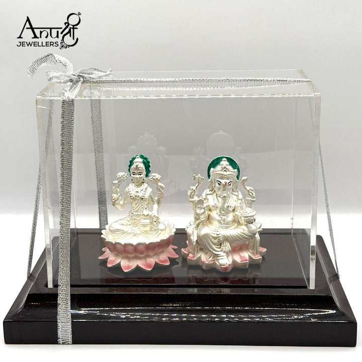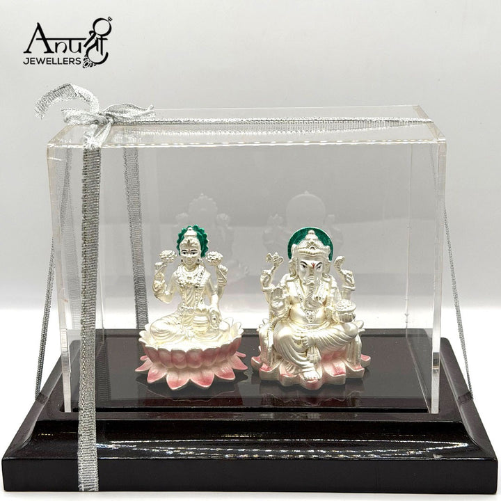 Divine Silver Lakshmi and Ganesha Idol Set. Weighing 66.280 grams, this exquisite silver pair, featuring Goddess Lakshmi and Lord Ganesha seated on pink lotuses, is perfect for gifting or worship. Beautifully packaged in a clear acrylic box, it's an auspicious and cherished symbol of prosperity and good fortune.