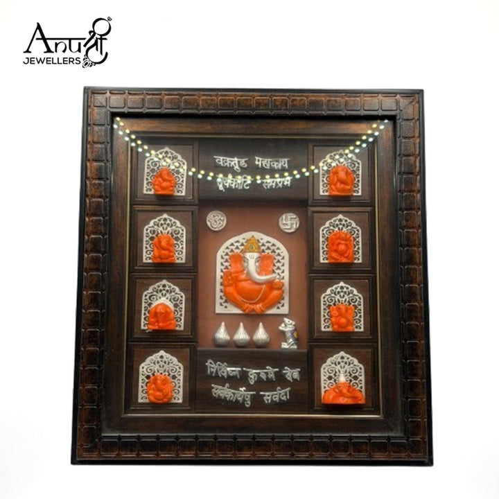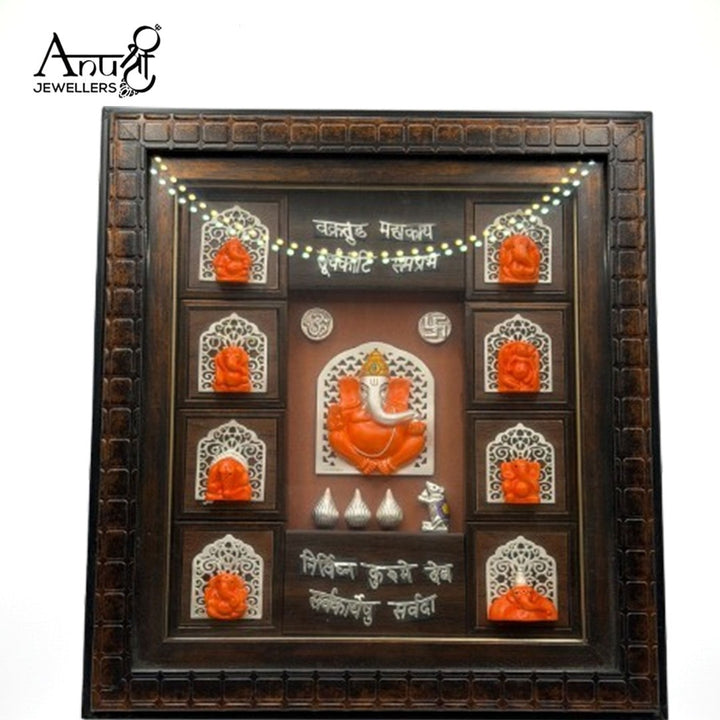 This beautifully crafted, dark wood-framed wall art features Lord Ganesha at the center, surrounded by smaller Ganesha (crafted from silver weighing 69.150 grams) depictions in traditional 'jharokha' style niches. Adorned with a delicate string of lights and Ganesha mantra. This is an impressive and spiritual addition to any home or office.