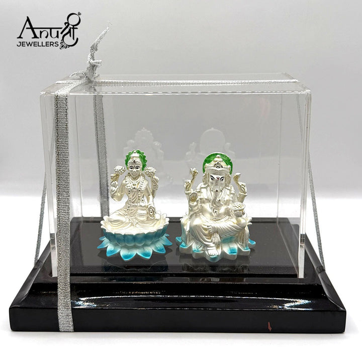 Silver Lakshmi Ganesha Idol Set. This exquisite 70.300-gram silver set features beautifully crafted idols of Goddess Lakshmi and Lord Ganesha, seated elegantly on blue and white lotuses. With subtle green detailing on the crowns, this auspicious pair is presented in a clear box, making it an ideal symbol of prosperity and good fortune for any special occasion.