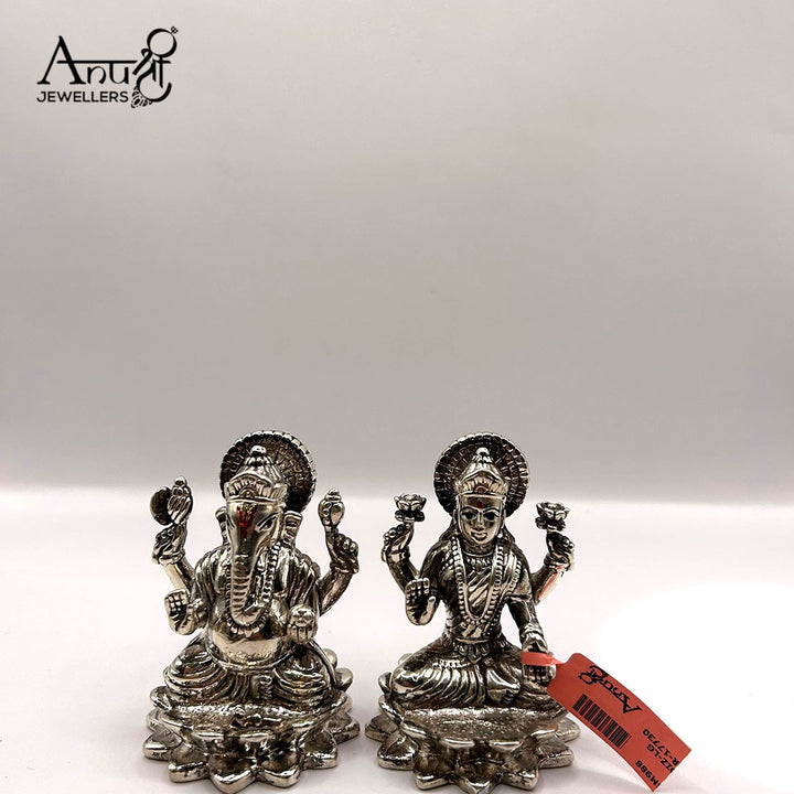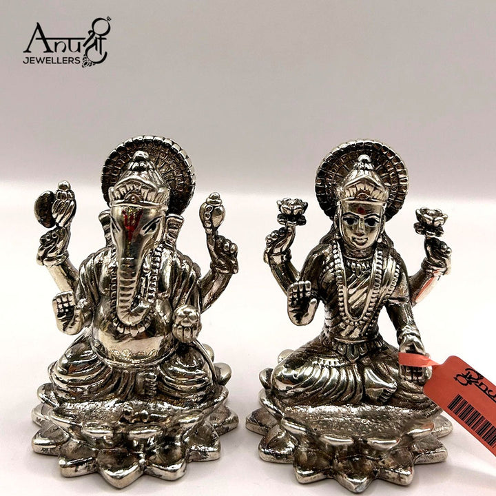 An auspicious pair of Ganesha and Lakshmi in detailed oxidized silver. Seated gracefully on lotus pedestals, they symbolize wisdom, prosperity, and new beginnings. A perfect, divine set for your home temple or festive gifting.