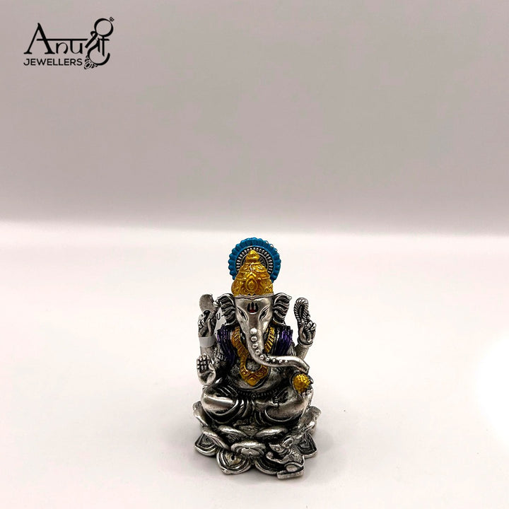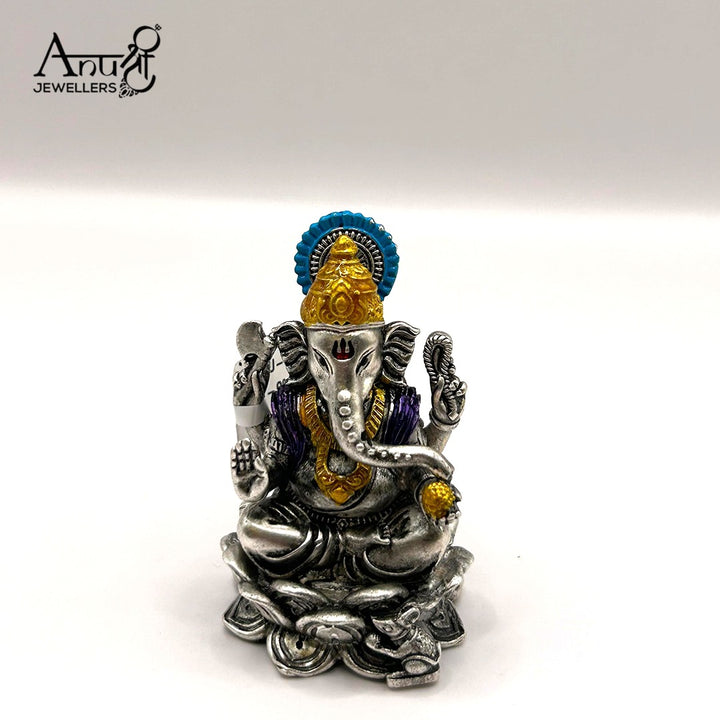 Divine Silver Ganesha Idol. This exquisite idol features Lord Ganesha seated on a lotus, crafted from fine silver with vibrant enamel detailing on the crown and robes. This devotional piece weighs 78.600 grams, making it a perfect symbol of prosperity and a beautiful addition to your fine jewellery collection or sacred space.