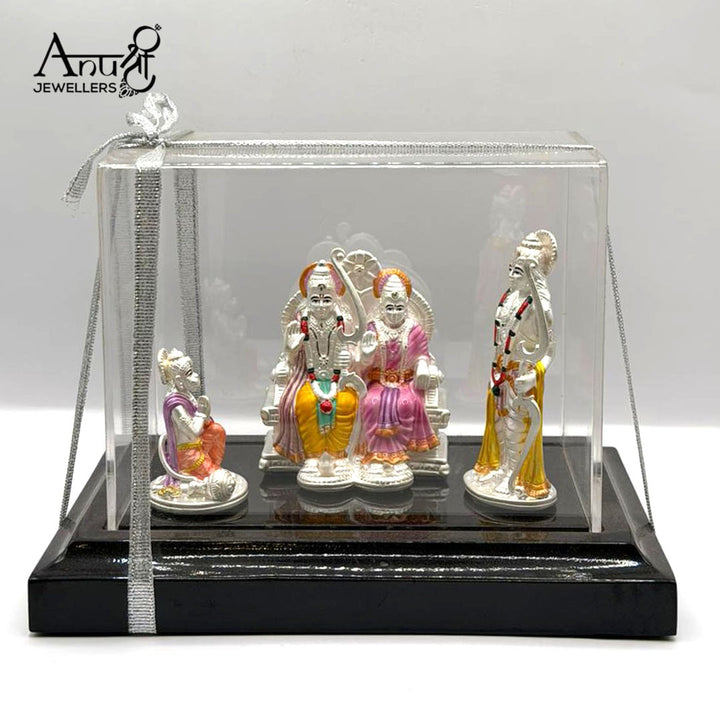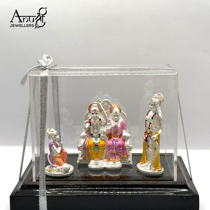 Silver Ram Darbar Idol Set. This deeply spiritual 94.560-gram silver set depicts the revered Ram Darbar, featuring Lord Rama and Goddess Sita seated on a throne, flanked by Lord Lakshmana and kneeling Lord Hanuman. Finished with vibrant color accents and presented in a clear box, this set from Anushree Jewellers is a cherished and auspicious piece for gifting or devotion.