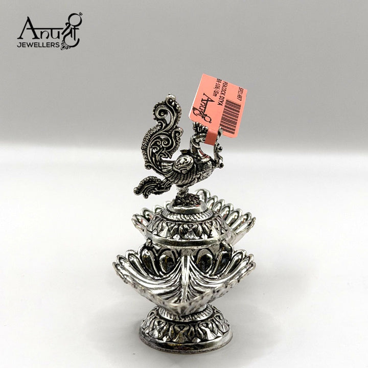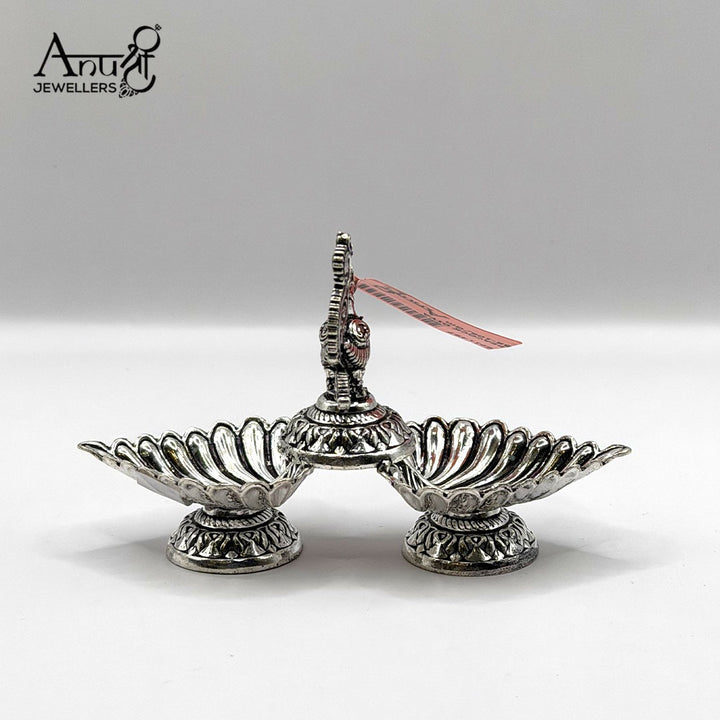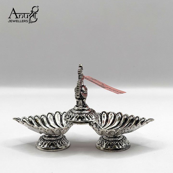 This charming 51.700-gram silver piece is a classic Indian puja item featuring two petal-shaped bowls connected by an ornate pedestal with a peacock finial. This elegant silver Diya is perfect for daily religious rituals and altar decoration.