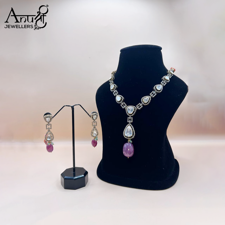 This delicate, contemporary necklace and earring set showcases traditional Polki craftsmanship, featuring beautifully arranged elements that lead to a prominent pendant with a large, faceted, purple or magenta stone drop. The set, weighing 11.610 grams, is a lightweight yet luxurious piece of fine jewelry, perfect for formal occasions.