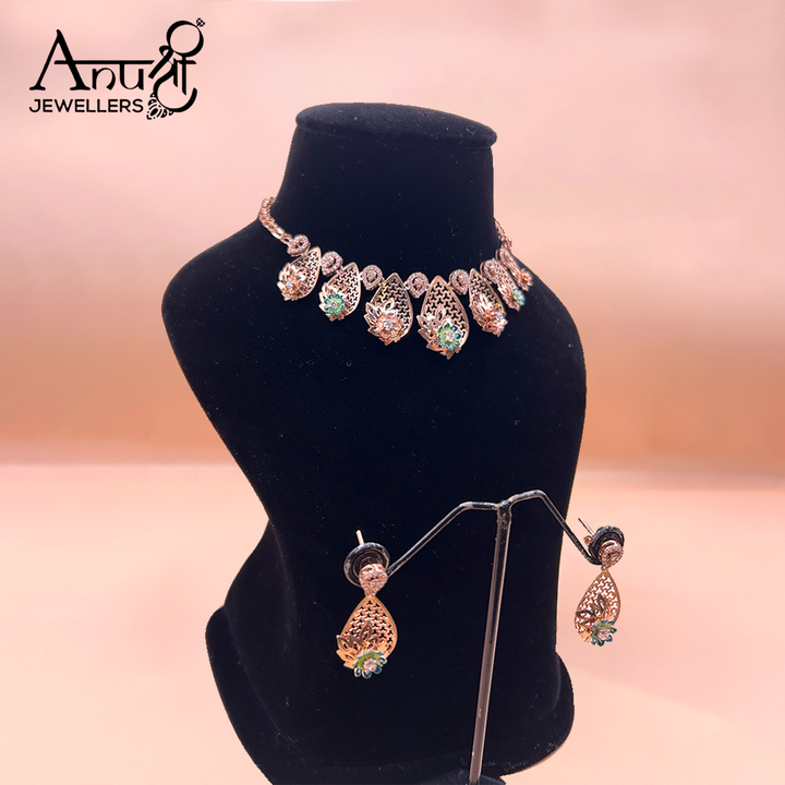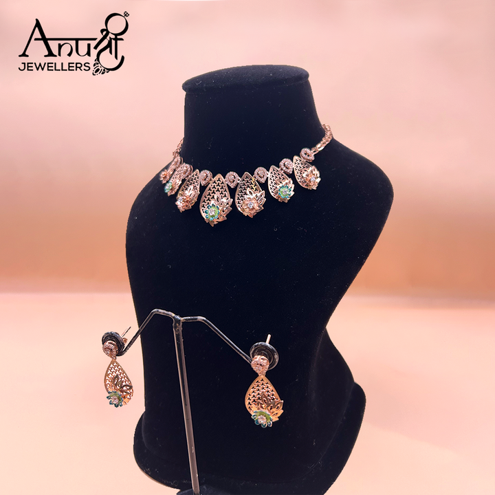 This elegant silver jewelry set features a matching necklace and earrings with intricate teardrop designs and colorful gemstone accents. The necklace showcases graduated teardrop pendants with detailed metalwork, while the coordinating drop earrings complete the sophisticated look. Perfect for special occasions or formal events.