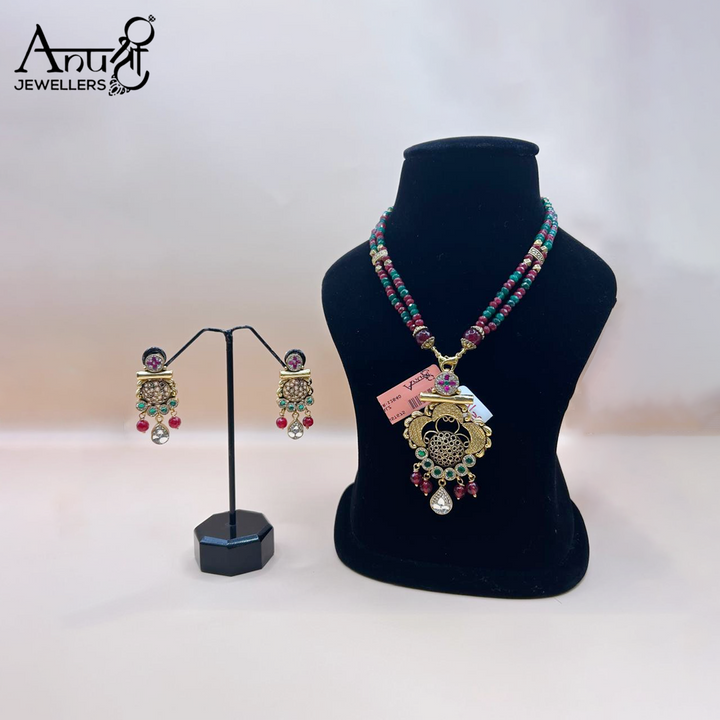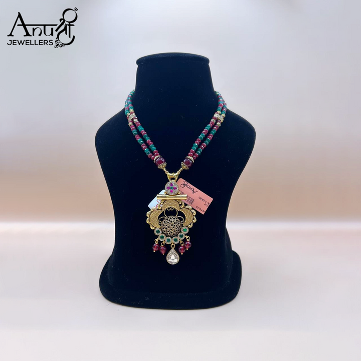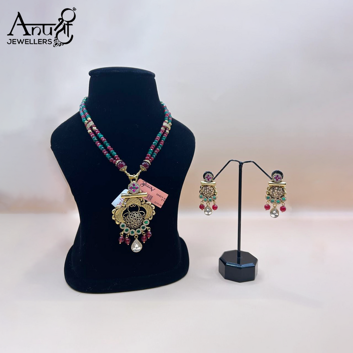This is a traditional choker-style necklace and earring set with an antique or gold-toned finish. The set features a blend of red and green beads in the chain, leading to a large, ornate pendant adorned with colorful gemstones and a teardrop accent. The set, weighing 25.680 grams, is a bold, culturally rich statement piece ideal for festive occasions.