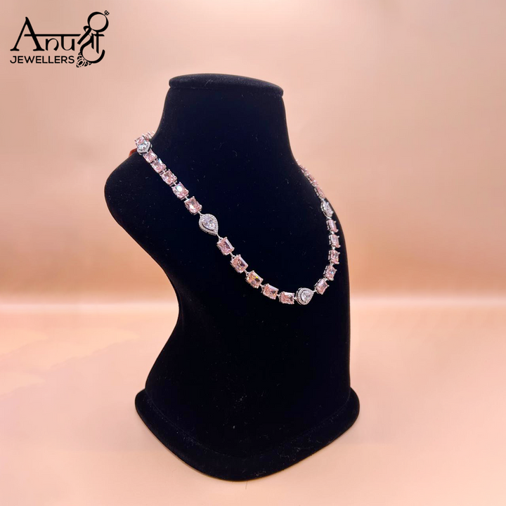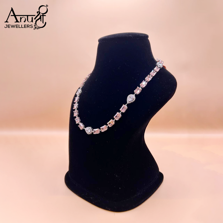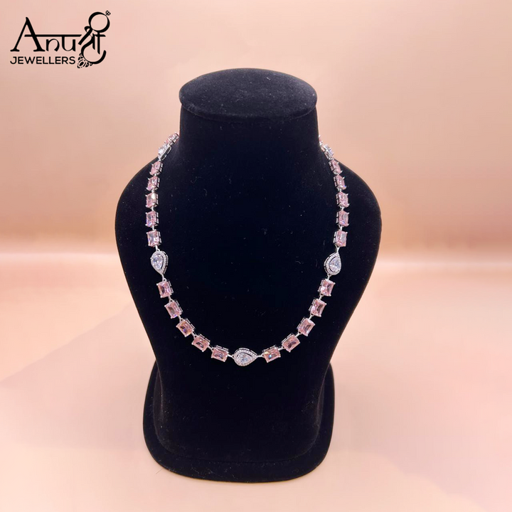 This is asparkling, contemporary necklacefeaturing a repeating pattern of rectangular,pink-hued stonesseparated by small, white-accented links. The design includes delicate teardrop-shaped elements for variation. This elegant piece of silver jewelry, weighing40.300 grams, offers a sophisticated and eye-catching look.